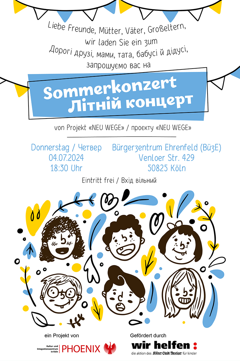 Das Projekt „NEUE WEGE“ richtet sich an Kinder und Jugendliche (8-16 Jahren) aus der Ukraine. In fünf schulbegleitenden Kursen können die Kinder und Jugendliche ihr Können auf kreative Art und Weise ausleben. Angeboten werden kreative und künstlerische Kurse, ein Chor zum musikalischen Experimentieren und diverse sprachliche Angebote für Alltagssprache in deutsch- und englisch. Neben den Kursangeboten gibt es regelmäßige Exkursionen im Stadtraum sowie im Umland, damit die Kinder und Jugendliche ihre neue Umgebung kennenlernen und zu ihr einen Bezug aufbauen können. Zum Ende des Kursjahres präsentieren die Kinder und Jugendliche gemeinsam die Ergebnisse ihrer Arbeiten.